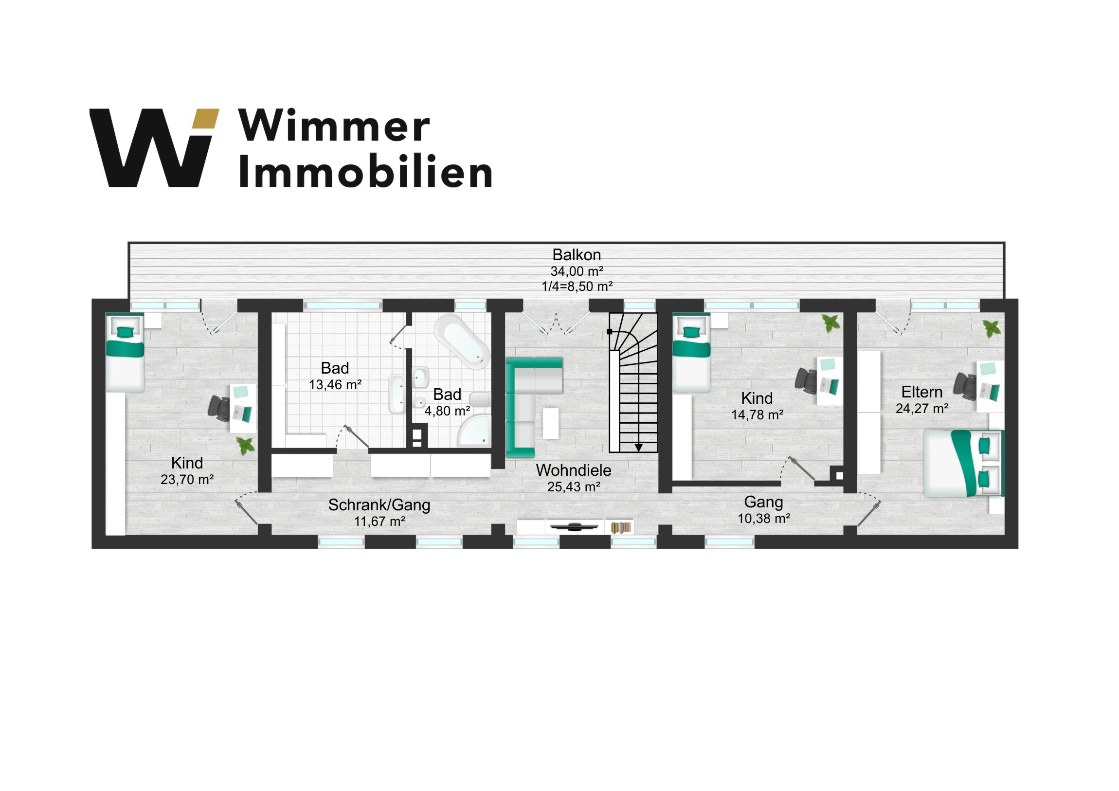 Das Haus umfasst insgesamt sechs Zimmer, darunter drei Schlafzimmer und ein Badezimmer. Die Räume verteilen sich auf zwei Ebenen und bieten viel Potenzial für individuelle Gestaltung. Hohe Decken und große Fenster sorgen für eine helle und einladende Atmosphäre. Aufgrund der großzügigen Aufteilung der Zimmer entsteht ein angenehmes Raumgefühl. Der große Balkon erstreckt sich über die gesamte Hausbreite und lädt zum Entspannen und Verweilen ein.