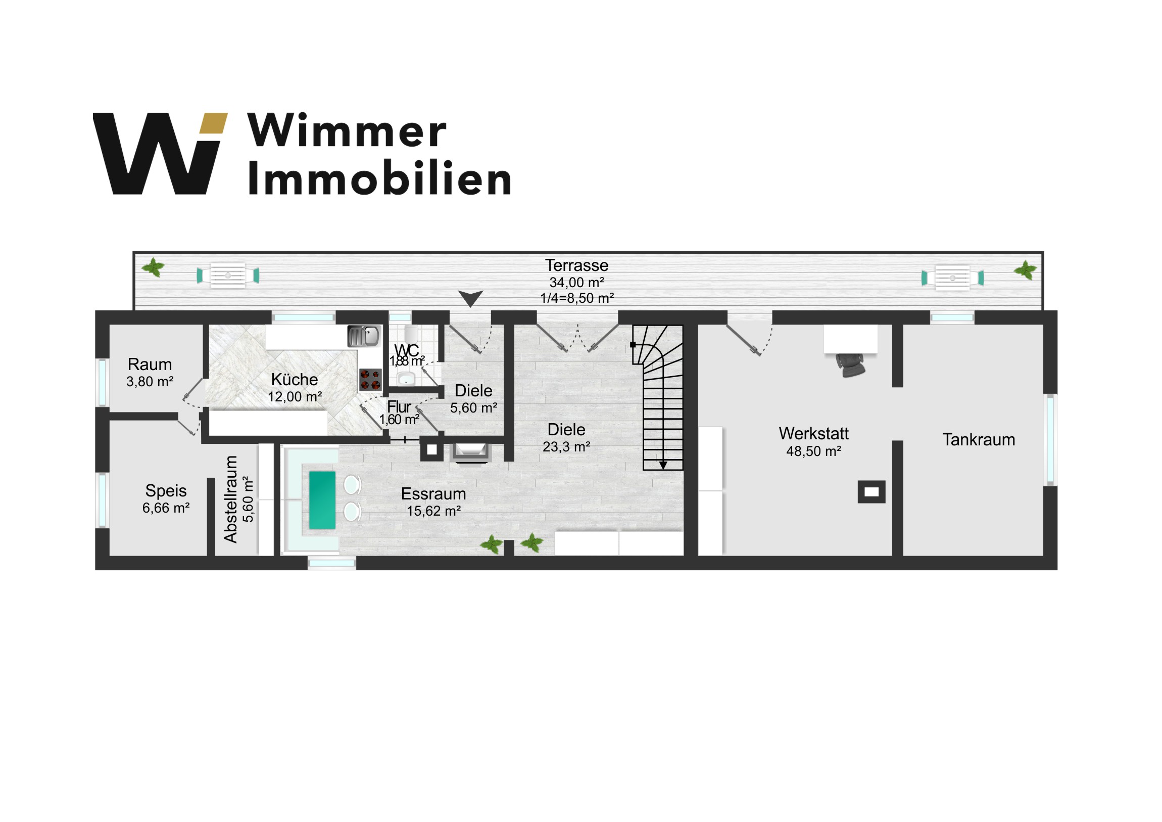 Das Grundstück erstreckt sich über ca. 1.110 Quadratmeter, welches eine uneinsehbare Oase bietet. Ein eigener Bachlauf, der durch das Grundstück fließt, bildet das Highlight.